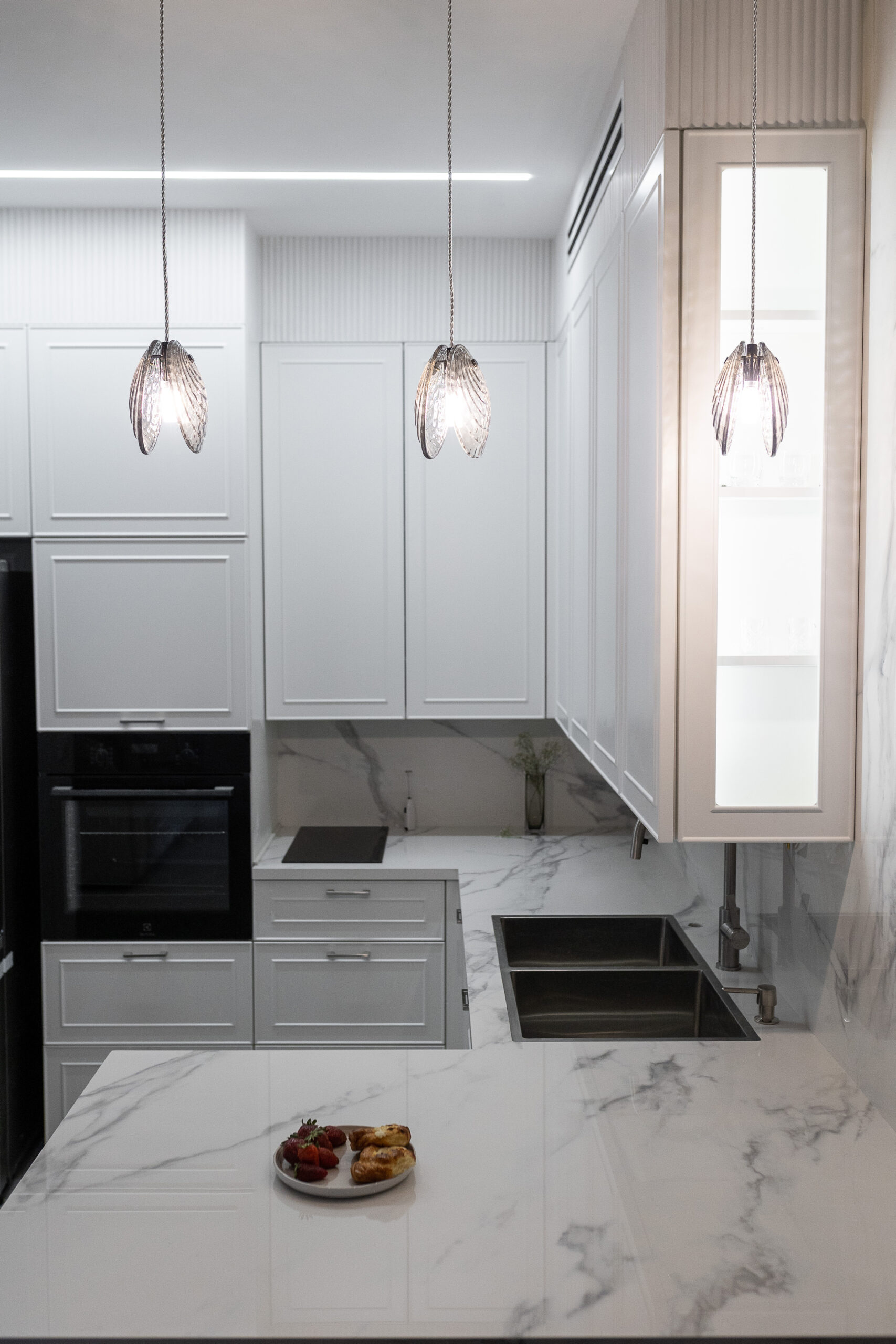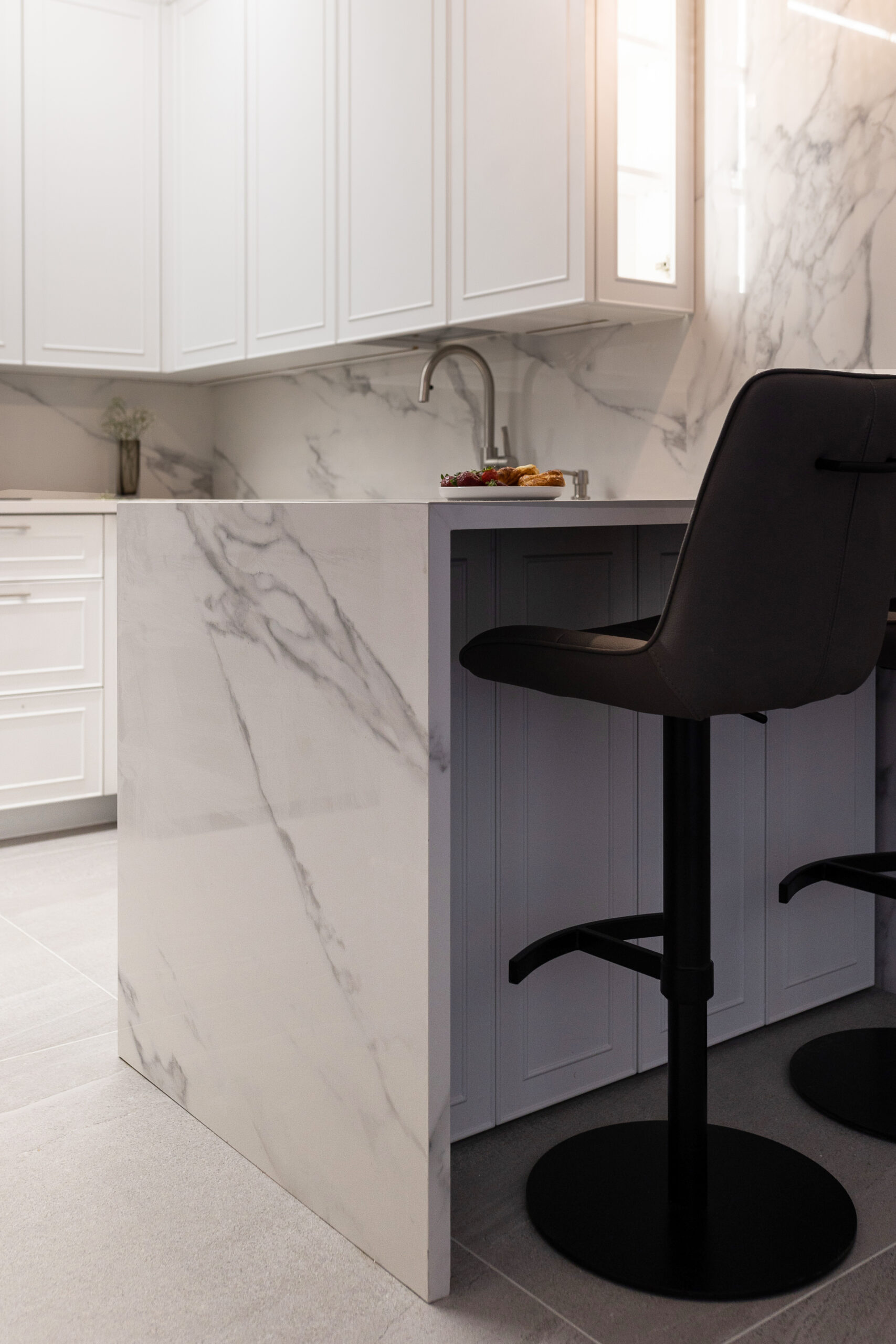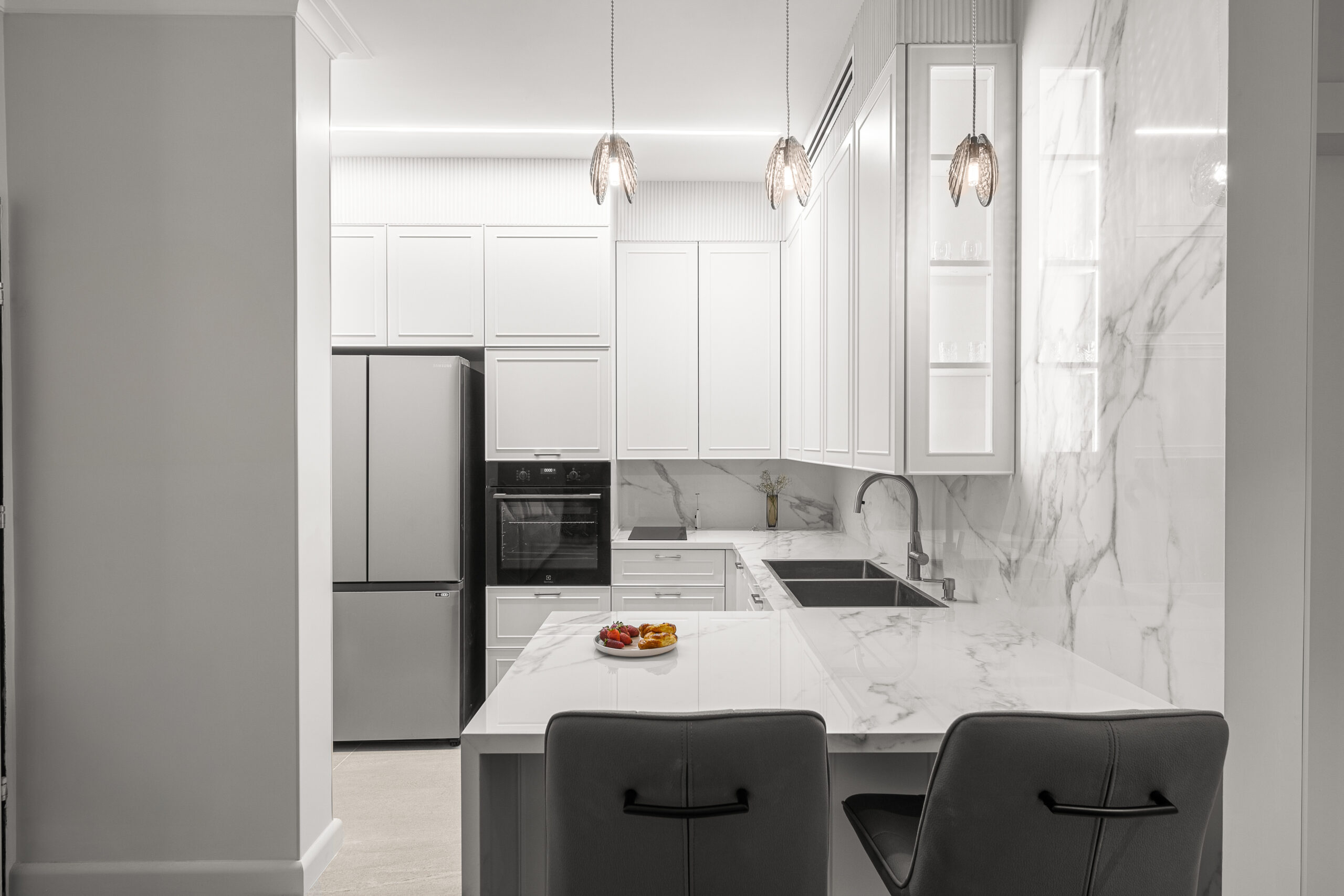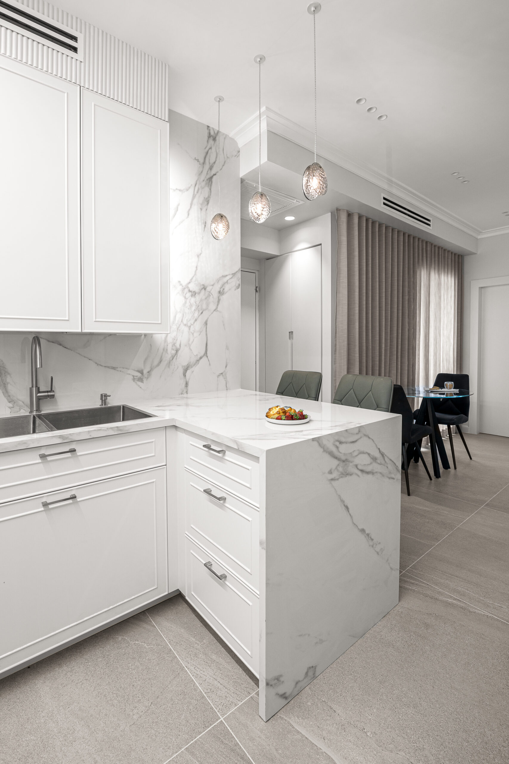 הארונות בגימור מאט לבן משתלבים באופן מושלם עם חיפוי הקיר ומשטח העבודה, שמגיעים באותו דגם שיש ליצירת רצף הרמוני. כיור כפול רחב, אי פונקציונלי עם מקום ישיבה ותאורה תלויה בעיצוב עדין משלימים את המראה היוקרתי והמאוזן של המטבח.