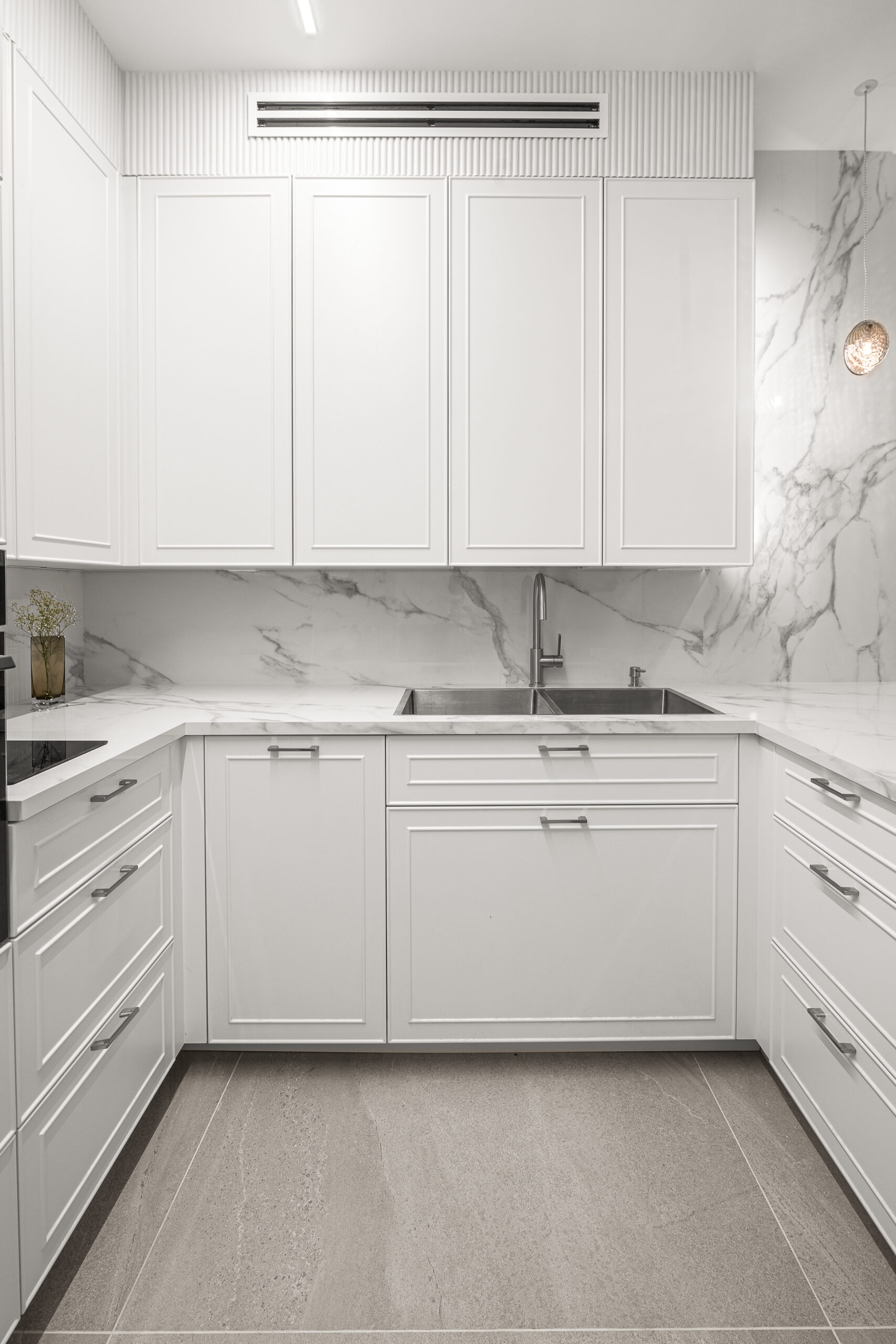 מטבח הלסינקי עוצב בהשראת הערים הסקנדינביות – בהן שקט, סדר ואור טבעי הם חלק בלתי נפרד מהשגרה. קווי העיצוב הנקיים, הגוונים המונוכרומטיים והשימוש הנרחב במשטחי שיש לבן עם ורידים מעודנים, יוצרים תחושת ניקיון, מרחב ושלווה עיצובית.
